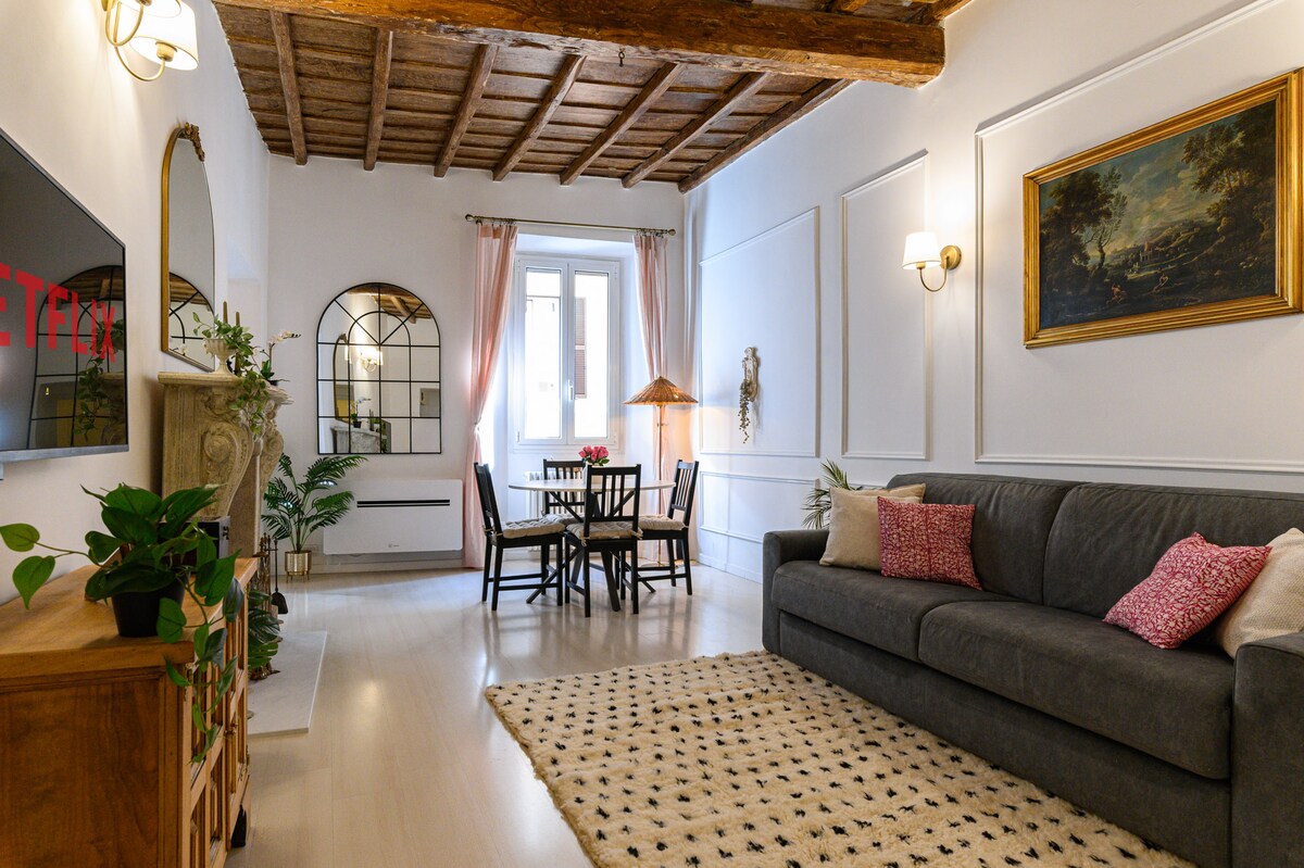 Exclusive cozy apartment for tourist use with breathtaking frontal views of the iconic Pantheon,ancient Temples of roman Gods and Emperors.The100sqm apartment is a romantic retreat adorned with wooden beams that enhance its historic charm on the sofa in the living room with 3 French windows(Juliet balcony),overlooking the columns of the Pantheon. Here you can relax while drinking a cup of tea or glass of wine admiring the Pantheon as if it were at your fingertips.Completely renovated in2025