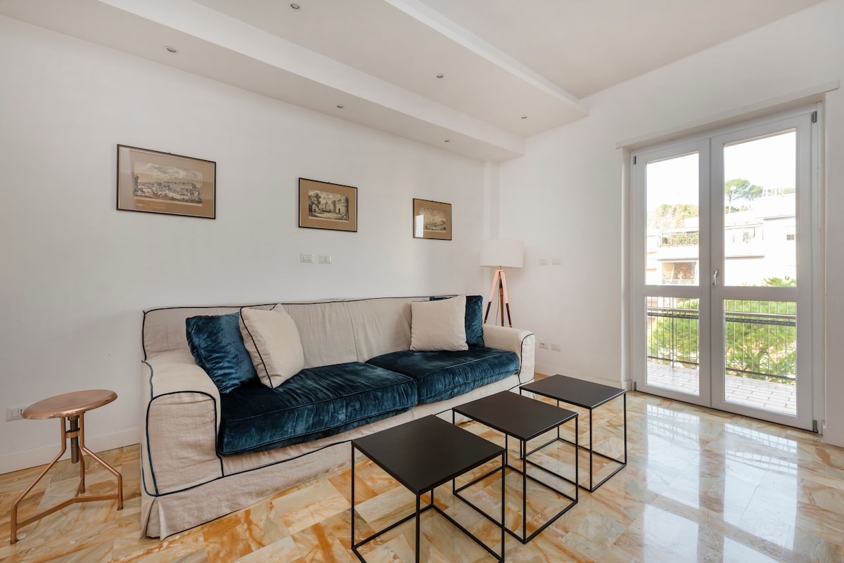 Enjoy a coffee at the marble breakfast bar, relax in the cozy window seat, or dine on the spacious terrace. This elegant apartment blends wood, marble, and traditional ceramics in a warm, refined style. Designed by renowned Roman interior designer Alessandra Danese, it holds the Plum Guide Luxury Apartment Certificate of Excellence. Guests enjoy full amenities including Wi-Fi, Nespresso machine, and a furnished terrace. Located in authentic Rione Monti, loved by locals.