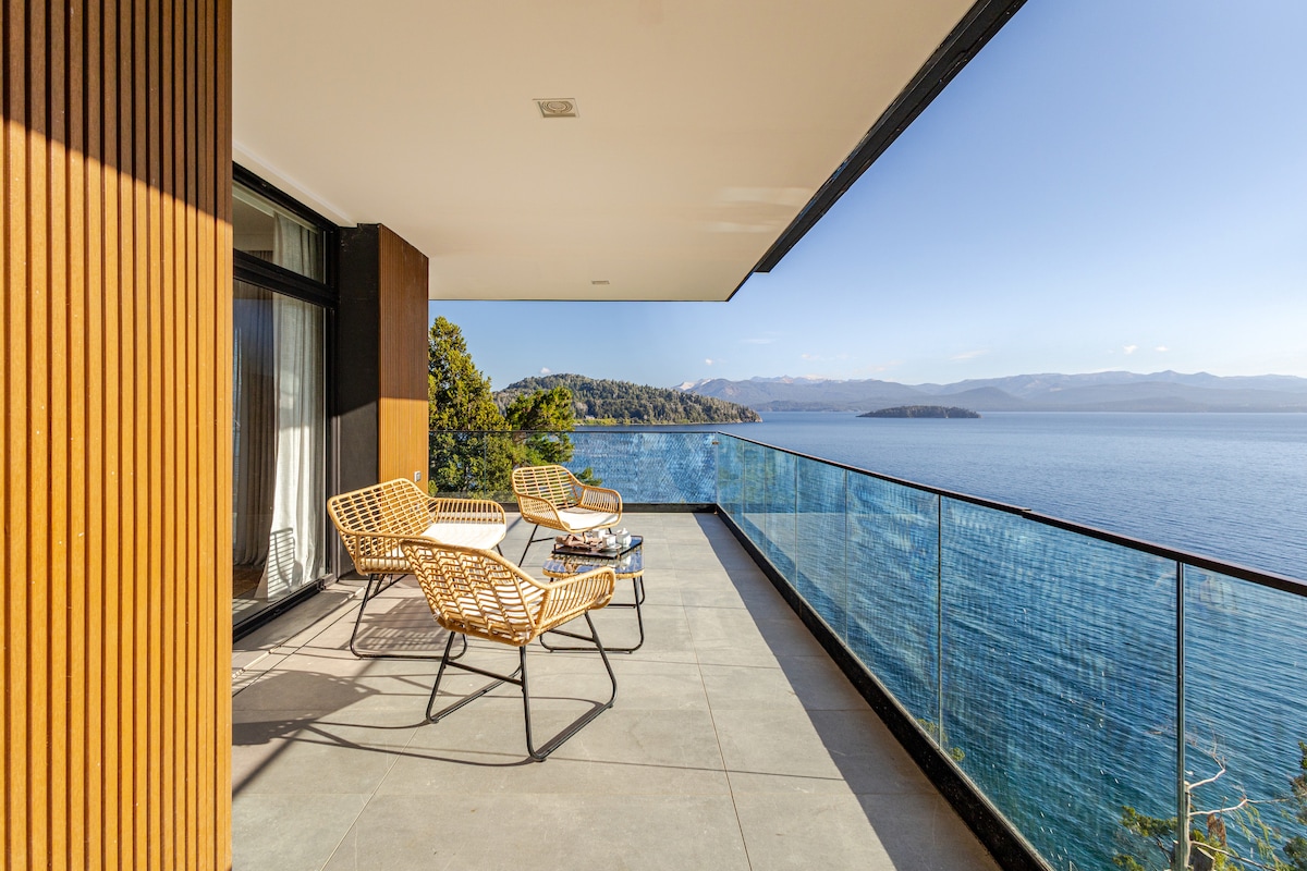 Departamento en modulo AIRE para 3/4 pax con increíble vista al lago. Habitación con cama matrimonial y sofá cama matrimonial en el living. Baño completo con ducha. Cocina con vitrocerámica y horno eléctrico, heladera con freezer, microondas, vajilla completa. Terraza con living exterior. Smart TV - Wifi 180MB. Pileta climatizada, Jacuzzi, solarium, gimnasio y sauna. Deck con parrilla completa y mesa para uso común. Calefacción por losa radiante. Parking cubierto. Acceso privado a la playa.