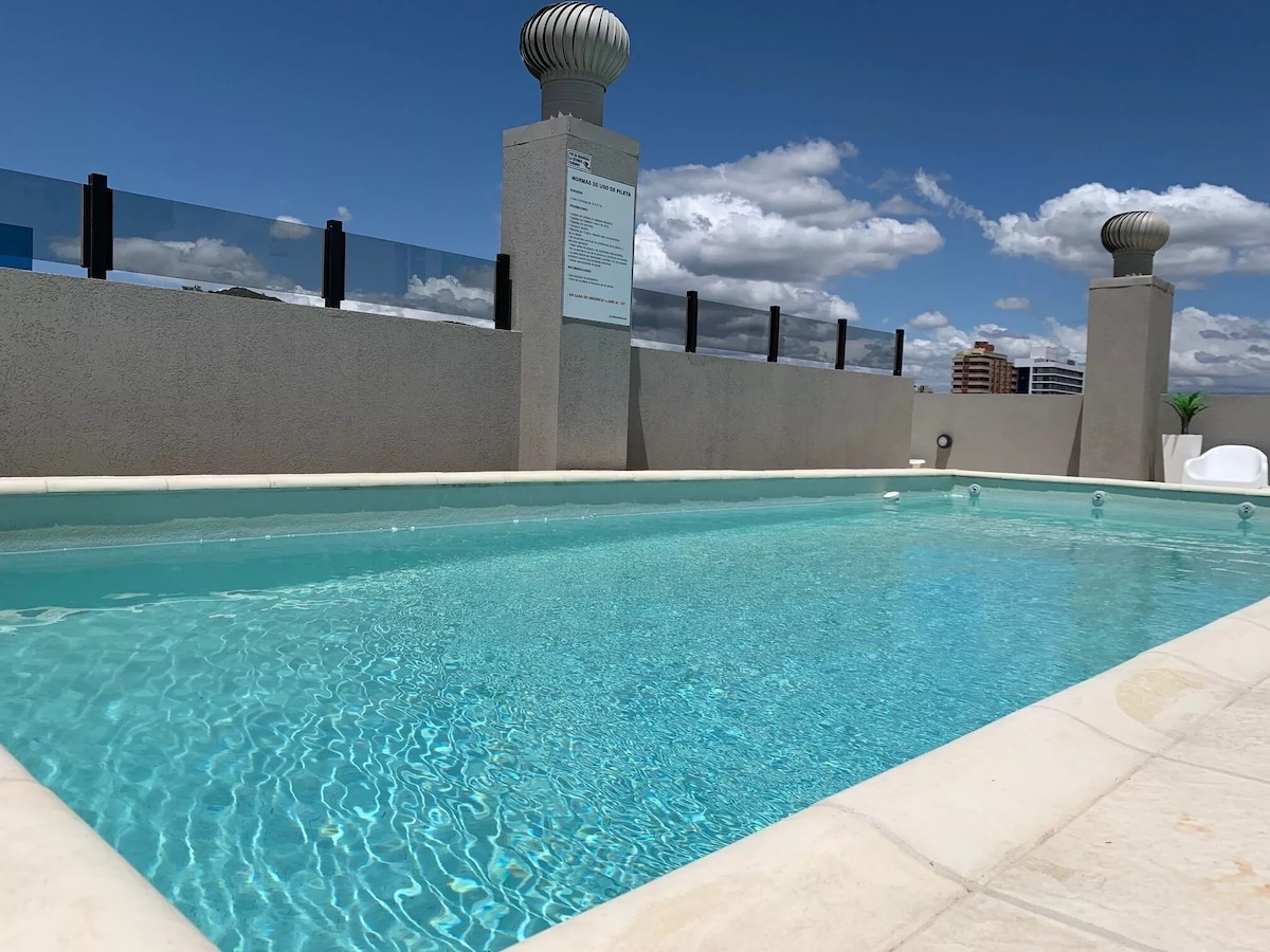 Excelente ubicación, cerca de todo, a 150 mrs del centro ( área peatonal), teatros, cines, shoping wo, casino, bares y restaurantes. a 250 mts de las costanera. Desde la terraza vistas 360 a la ciudad, sierras y lago. El dpto. cuenta con todo lo necesario pata una confortable estadía. Cochera propia en el edificio. El área al aire libre, la terraza cuenta con piscina,solarium, parrillero equipado con cocina, heladera,aire acondicionado. El edificio cuenta con seguridad las 24hs..