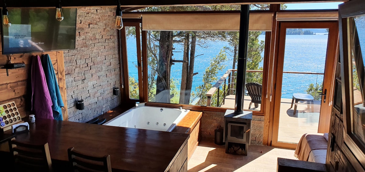 Cálida cabaña de estilo rústico a orillas del lago Nahuel Huapi con hidromasaje, hogar a leña, y deck. Monoambiente creado para el relax y el romanticismo con vista al amanecer y salida de la luna sobre el lago. Smart TV e internet por FIBRA OPTICA con wifi para trabajar. Una kitchinette con todo lo necesario, incluyendo cafetera dolce gusto. Caja de seguridad para resguardar tus notebooks al ir de paseo. Baño completo. Pool, ping-pong. Playa: Kayak y standup paddle. Desayuno continental.