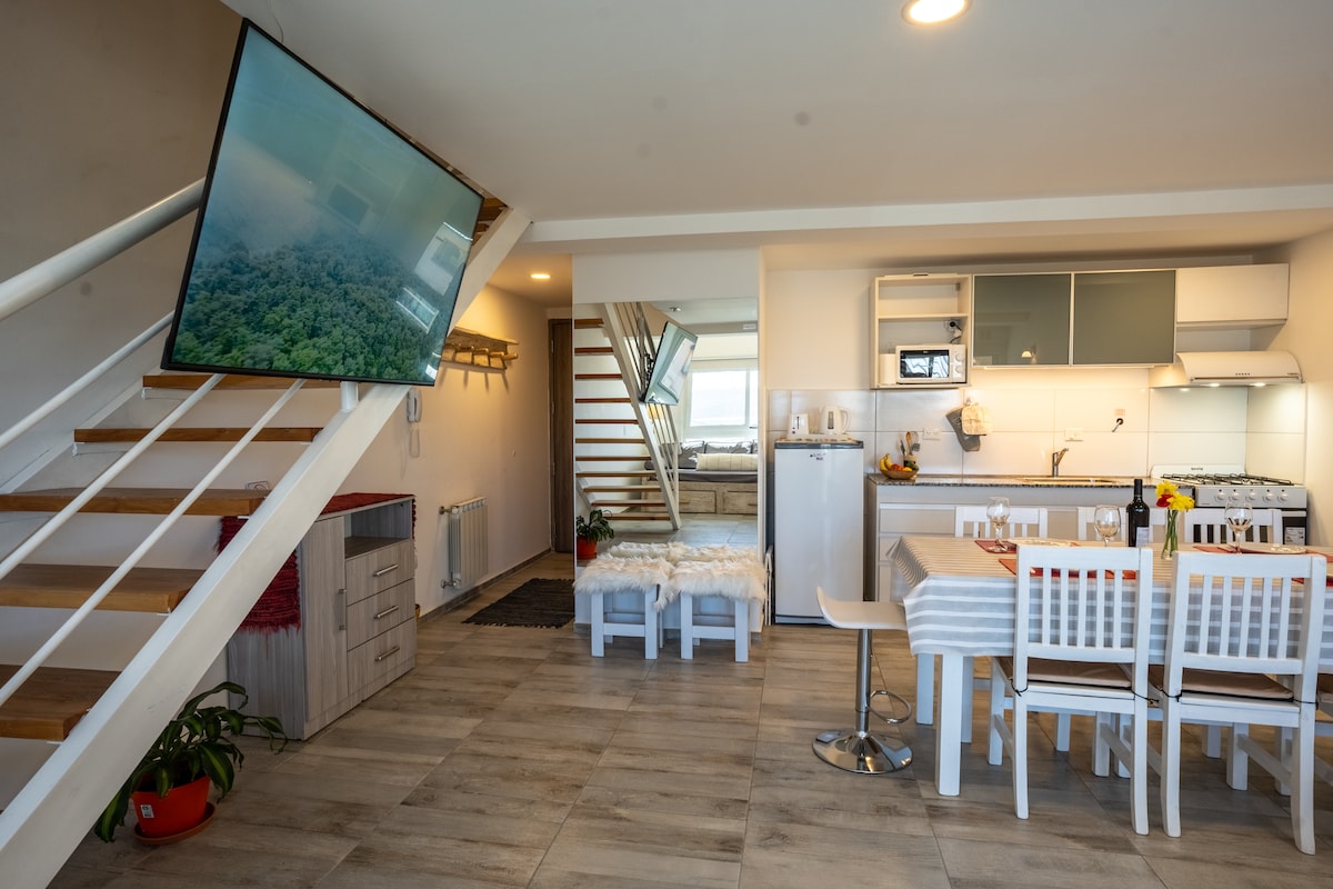 🌿 Monoambiente con terraza en pleno centro de Bariloche Disfrutá de una estadía cómoda y práctica en este monoambiente moderno ubicado sobre la Avenida San Martín, una de las zonas más buscadas de la ciudad. Ideal para parejas o viajeros que quieran estar cerca de todo y recorrer Bariloche caminando. El departamento cuenta con terraza privada con mesa y sillones, perfecta para descansar después de un día de excursiones.