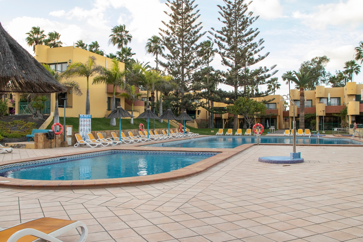 Apartment with private terrace, 100 meters from the sea and located in the best area of Corralejo. The lively center is only 10 minutes away on foot and less than 5 minutes by car from the incredible beaches of the Corralejo Dunes. In a quiet complex with large well-kept gardens and several large pools. Next to the beautiful El Campanario Shopping Center with: supermarket, ATM, shops, markets, entertainments, medical center,... *Wifi 350 Mbps*