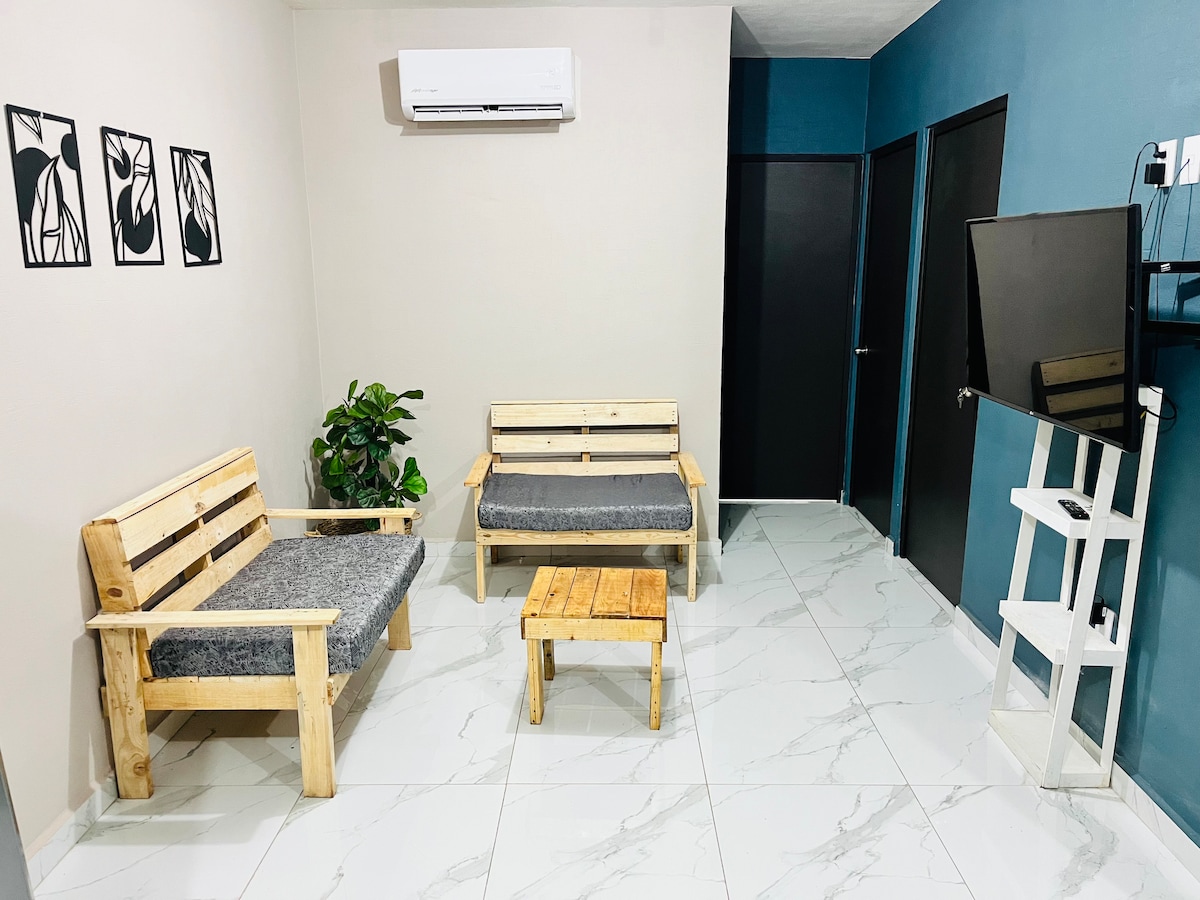 Enjoy a modern, colorful space filled with natural light and great ventilation Features 3 bedrooms: 🛏️ Master bedroom with air conditioning and private bathroom 🛏️ Second bedroom with air conditioning 🛏️ Third bedroom with a portable fan and large windows Additionally, you’ll have a full bathroom in the hallway, a fully equipped kitchen, a dining area for 4, and a cozy living room with a 42” Smart TV and fast WiFi. A space designed to make you feel right at home from the moment you arrive.