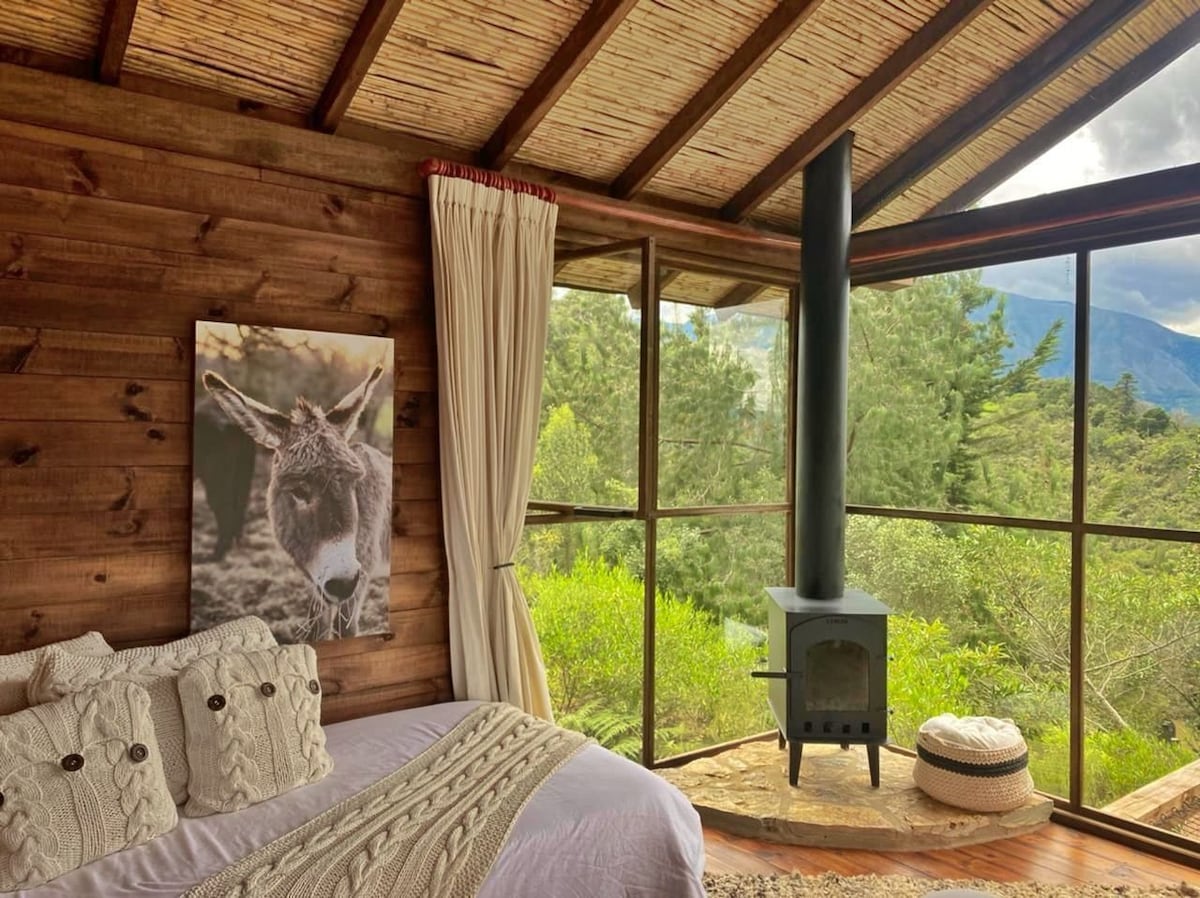 Conecta con la naturaleza en esta escapada inolvidable La cabaña esta ubicada en un bosque nativo de robles con acceso a la quebrada, tiene cocina, chimenea, minibar, salon de yoga, incluye desayuno que encuentras en el minibar, deliciosa tortilla española, granola y siempre tendrás cafe y te para preparar Estamos a 20 minutos de la estación de bomberos de Villa de Leyva en carro Vivimos en la misma finca a 60 mts tendrás privacidad total Del minibar puedes comprar snacks