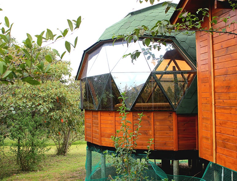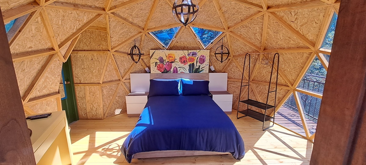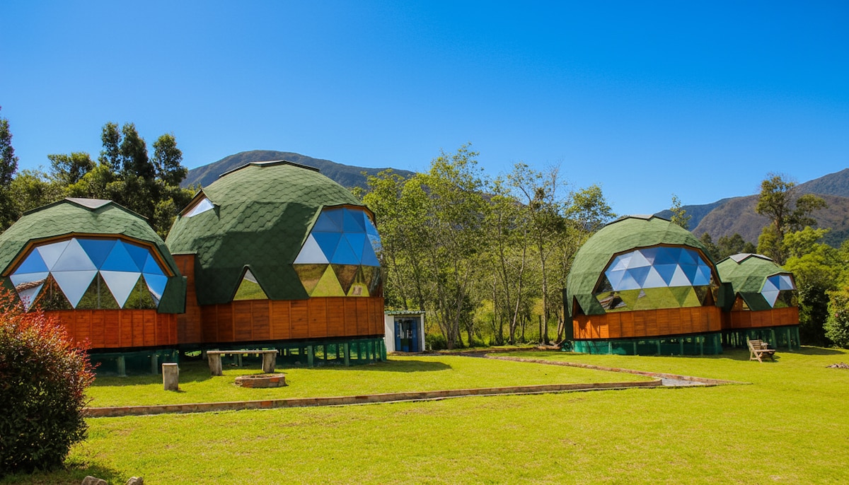 Domo geodésico de madera, acomodación hasta 3 personas. Baño privado, parqueadero, zonas verdes, agua caliente. Contacto con la naturaleza, paz, tranquilidad y serenidad. Espacio sagrado Muisca en destino turístico a 10 minutos del centros histórico de Villa de Leyva.