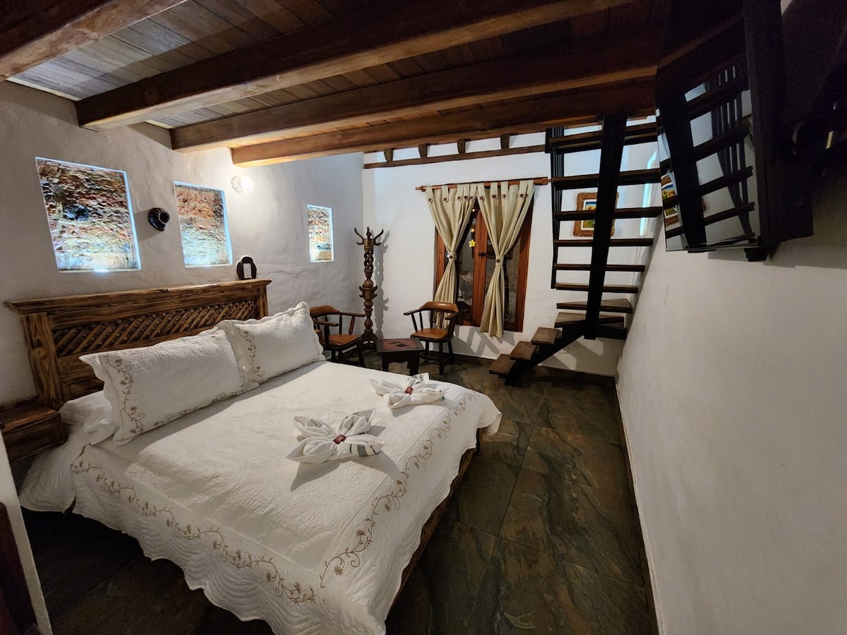 Esta linda habitación se encuentra en Casa Pancha Mama con una excelente ubicación a solo dos cuadras de la plaza principal. Es Ideal para que una pareja pase unos dias romanticos explorando la encantadora Villa de Leyva. Es amplia y acogedora aequipada con una cama doble y un banio completo . La habitacion tiene una hermosa vista al patio de la casa y a las montañas. Un delicioso desayuno esta incuido en el precio de la habitación.