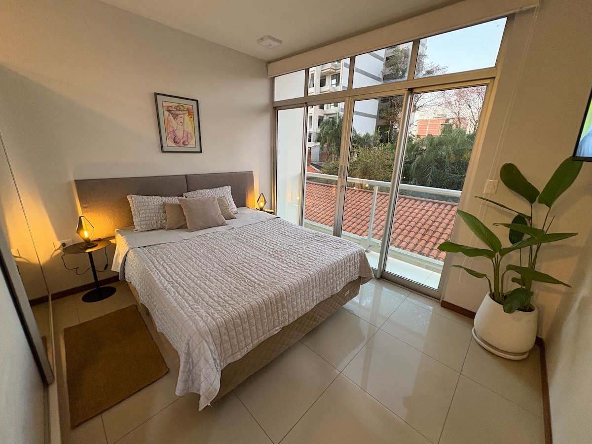 Una habitación, Aire Acondicionado, kitchenette completo con todo lo necesario, sommier y sabanas de 1800 hilos, balcón con parrilla para un rico asado! Wifi. Edificio con seguridad 24 horas, laundry, piscina, gimnasio, salones. A 2 km de shoppings, a metros de restaurantes y la mayoría de las oficinas corporativas. Existe un supermercado cerca donde encontrara de todo, además de farmacias y hospitales. La terminal de omnibus queda a menos de 5 km y el aeropuerto a 15 km