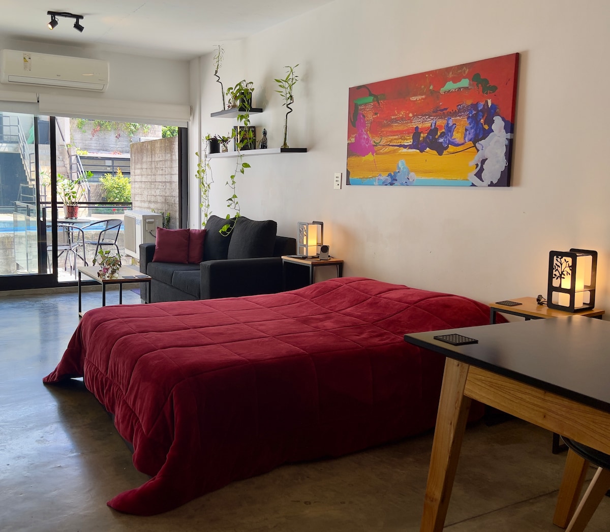 Bright, peaceful, and tastefully designed studio just off Plaza Armenia — the lively heart of Palermo Soho. Enjoy an airy space with fast 500 Mb/s internet, ideal for work or streaming. Remarkably quiet and restful — perfect for deep sleep — with blackout blinds ensuring total darkness. There’s also room for light exercise or yoga, with optional equipment on request. Step outside to cafés, restaurants, shops, yoga, tango and the weekend artisan market.