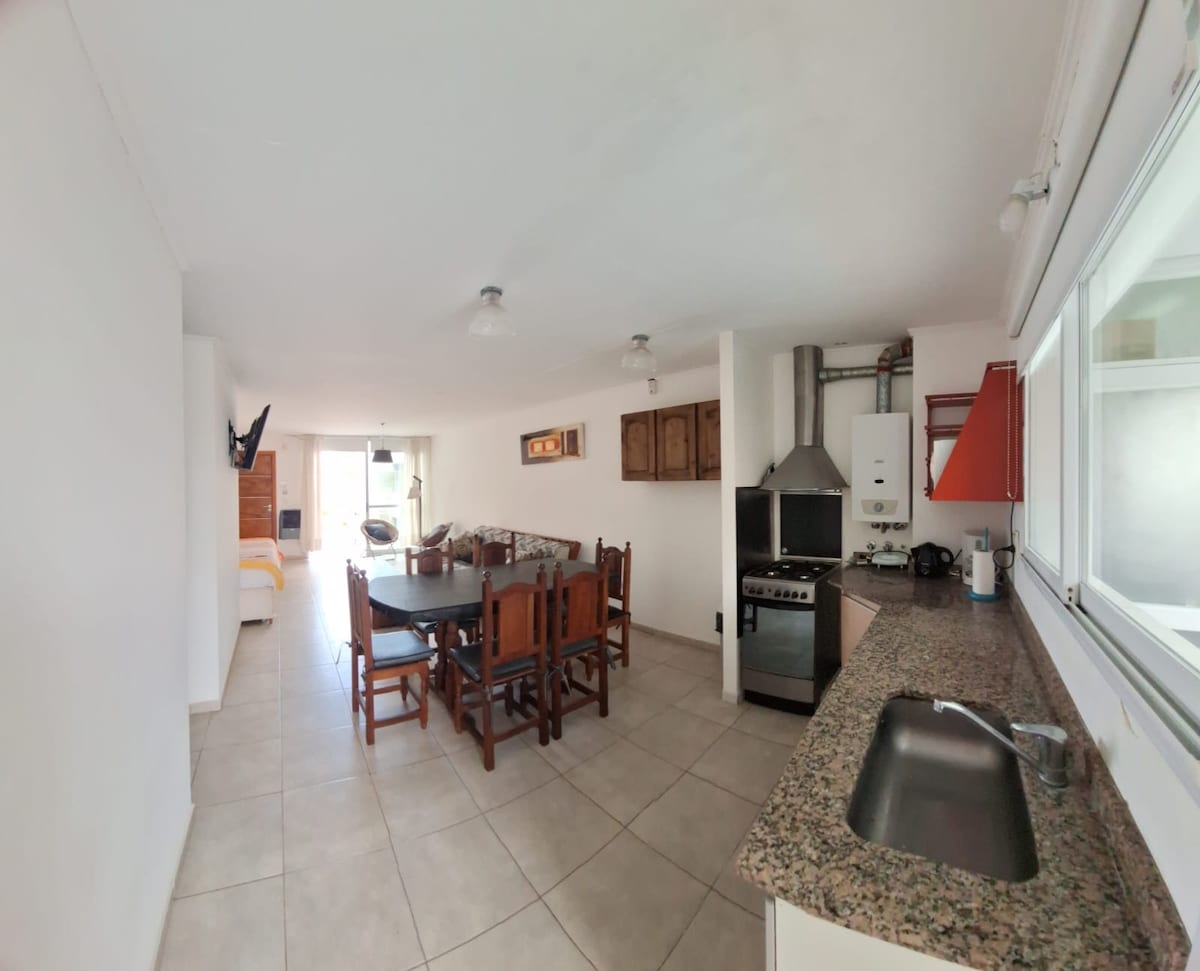 Viví la experiencia de estar cerca del Mar en nuestro departamento Pura Vida, Amplio y cómodo ideal para parejas o familias, ubicado en barrio Norte de villa Gesell, primera línea de playa, a 100mts del mar Cuenta con cochera privada, jardín grande con quincho y parrillas. El departamento tiene 2 habitaciones, una con cama matrimonial y la otra con dos camas cuchetas. Baño completo. Living comedor y balcón. Cocina equipada. Lavadero con una ducha para la vuelta de la playa Wifi y Tv, puravidadto