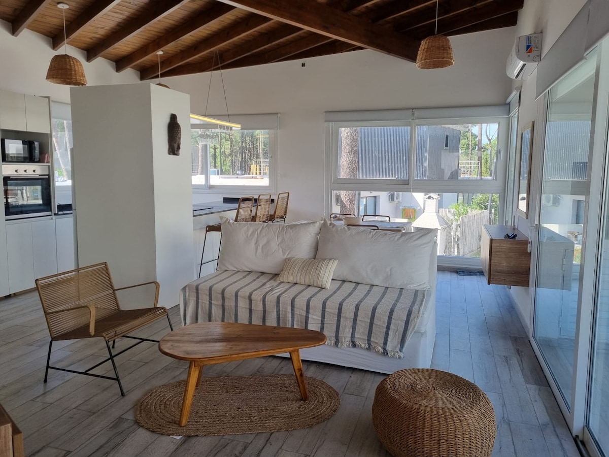 Te va a encantar mi espacio por que se encuentra inmerso entre bosque, medanos y el mar . Cuenta con amplias zonas exteriores para el esparcimiento de los niños y adultos . donde puedan jugar y divertirse alrededor de los fogones y las parrillas mientras los adultos disfrutan de un rico asado.......... El duplex cuenta en P.B con cocina completamente equipada, estar comedor, dos dormitorios, dos baños, uno en suite . Dos terrazas en P.B. Y en P.A. una terraza privada con jacuzzi y parrilla .