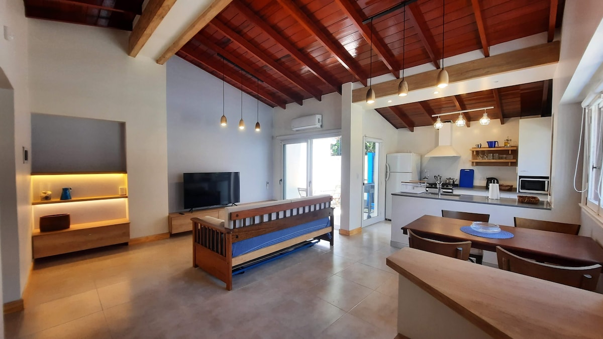 Dúplex moderno remodelado en 2024, rodeado de verde y a tan solo 100 mts de la playa. Relájate en este tranquilo alojamiento. En planta baja living con amplio sillón en L, TV, toilette , comedor y cocina integrada totalmente equipada con vajilla y electrodomésticos. En planta alta 1 habitación principal, baño completo y habitación secundaria con 3 camas simples. Condominio cerrado con amplio parque, wifi por fibra óptica, cocheras privadas y espacios comunes de parrilla y quincho.