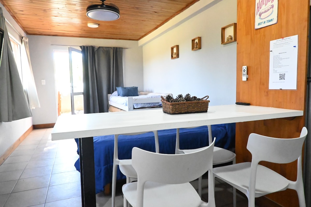 Duplex moderno remodelado en 2023, rodeado de verde y a tan solo 100 metros de la playa. En planta baja living con sillón y TV, toilette, comedor y cocina integrada totalmente equipada con vajilla y electrodomésticos, patio privado con living de exterior. En planta alta 1 habitación principal, baño completo y habitación secundaria con 3 camas simples. Condominio cerrado con amplio parque, wifi por fibra óptica, cocheras privadas y espacios comunes de parrilla y quincho.