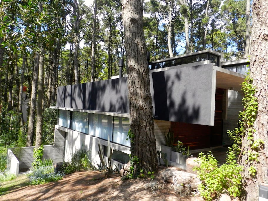 Moderna casa en el bosque de mar azul, a 9 cuadras del mar. Una zona segura donde vive gente de manera permanente durante todo el año. Espacios verdes para disfrutar y parrilla en espacio cubierto para hacer asados, incluso los días de lluvia. La casa cuenta con una cama doble (Queen) y un sofá cama individual (capacidad hasta 2 personas). Tiene una moderna salamandra para calentar la casa viendo el fuego de manera segura. Hermosas vistas al bosque. Conexión a internet por fibra óptica.