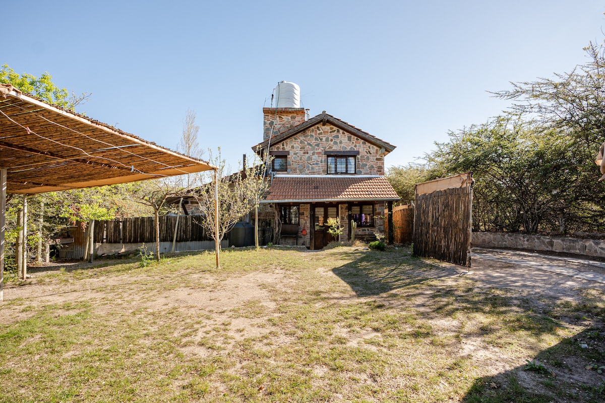 Casa ubicada en un campo de 20 hectareas de sierra y monte pero muy cerca del pueblo. Tiene una piscina, monte frutal y caballos. Es de un estilo rústico, con ventanales grandes. Es vecina al cementerio del pueblo para quienes sean supersticiosos. Aviso: la pileta recibe mantenimiento semanal pero al ser zona de campo puede acumular restos de hojas en el fondo