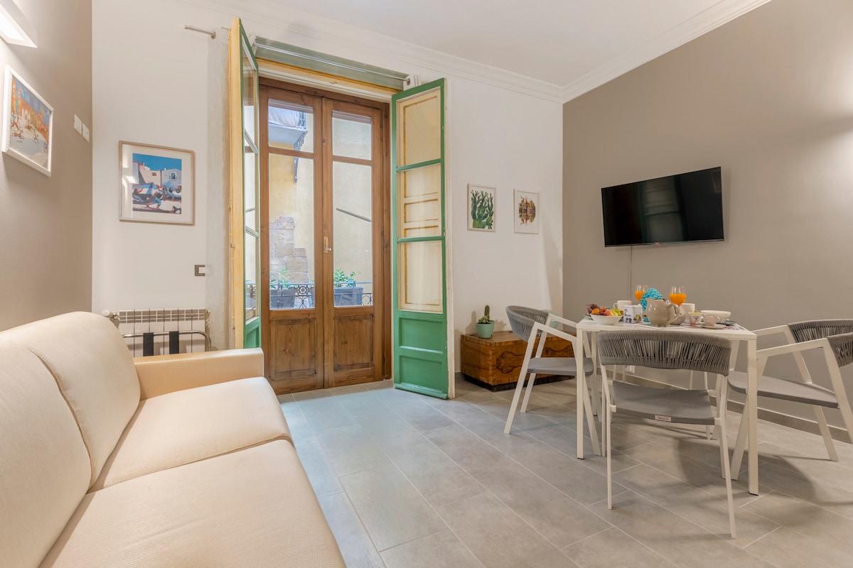 Super centrally-located apartment at the top of a palazzo in the heart of Kalsa, the trendiest neighbourhood in Palermo historic centre. If you manage to make it up the 4th floor of steep stairs (no lift), it will be worth it! The flat has been completely renovated by me, Roman architect who after 10 years of practice in London has decided to move to Palermo and open a studio here. The flat has 2 beautiful terraces, 1 bedroom 1 large kitchen living room, a study and 1 bathroom.