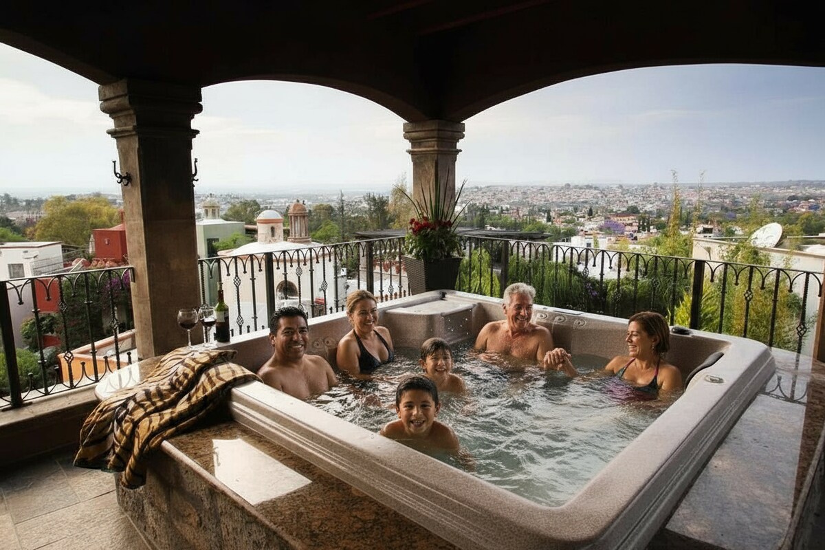 Welcome to Casa Callejón Blanco, your luxury retreat just a block and a half from the Main Square of San Miguel de Allende. This elegant five-bedroom home blends colonial charm with modern comfort: air conditioning in every room, a heated jacuzzi on the rooftop terrace with panoramic views, and a grill for enjoying the outdoors. Relax, explore the city’s best bars and restaurants, and experience an unforgettable stay in the heart of San Miguel