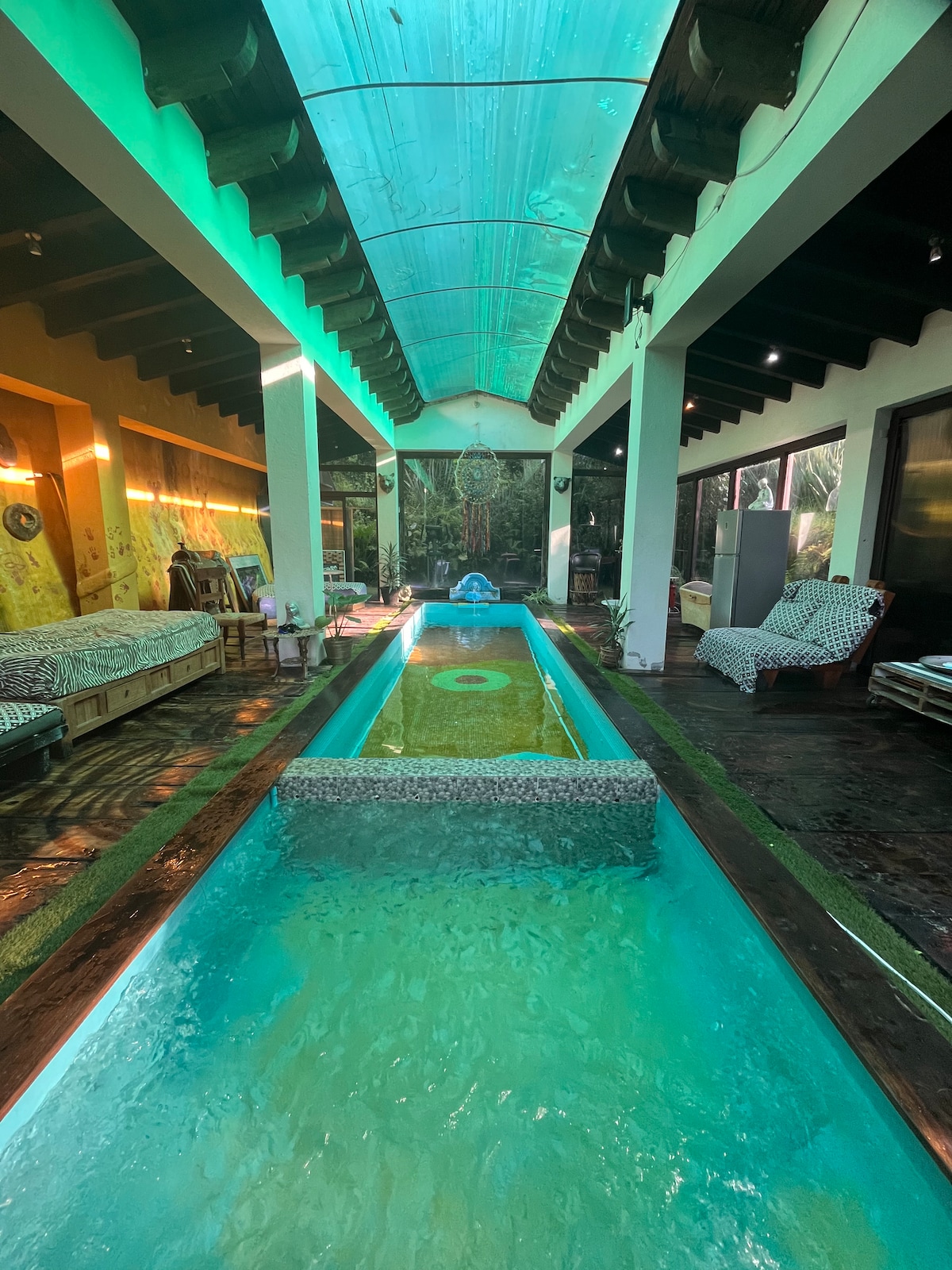 TERMALISMO CÓSMICO: Su hot tub infinito se funde visualmente con el lago de Valle, creando un espejo líquido donde el Nevado de Toluca se refleja al amanecer. Sumérjase en aguas termales mientras las garzas dibujan círculos perfectos en el atardecer. RITUALES: 6:47AM vapor sagrado con rayos sobre volcán. Amanecer de colores. Noche flotación bajo constelaciones. ESPACIOS: Hot tub panorámico, cama king algodón egipcio, terraza privada con sonido de olas. Solicite su ceremonia de aguas eternas.