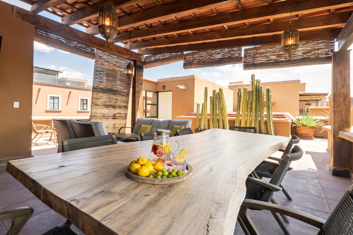 Luxurious Colonial Villa located in the heart of the magical town of San Miguel de Allende, just two streets from the Parroquia by flat walk. Daily maid service, swimming pool. • Luxurious living space & gloriously comfortable bedrooms • Rooftop terrace with breath-taking city views • Outside dinning space • Swimming pool • Onsite secured free parking * Massages Service * Continental breakfast (Cook Breakfast is an Extra)
