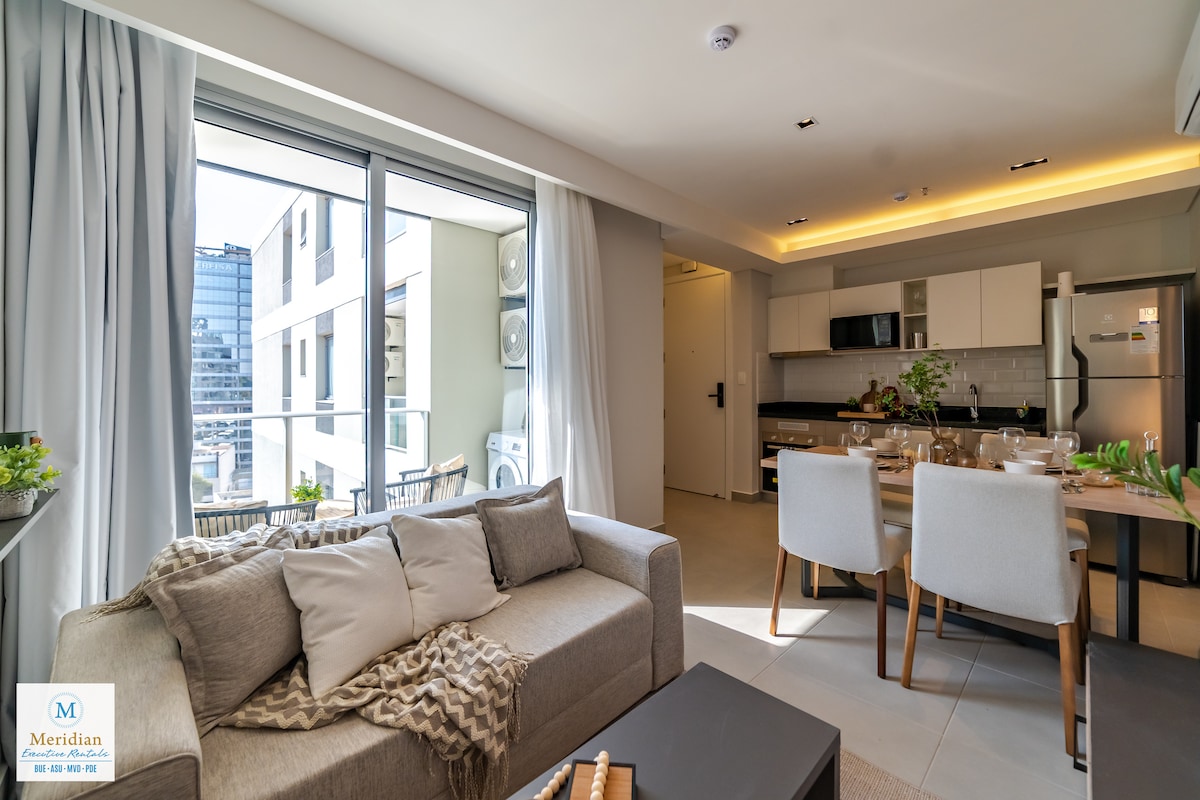 Desperta con hermosas vistas a la bahia en este moderno y amplio departamento en barrio Las Mercedes. La unidad cuenta con sala comedor cocina integrada; balcon con parrilla y dormitorio, ambos con vistas a la bahia, y baño super equipado. Ademas el edificio ofrece gym, pileta y salon de eventos para 20 personas. Con amplisima oferta gastronomica en el barrio. A lado del edificio encontraras una de las mejores cafeterias de Asuncion. 5 minutos del centro de asuncion y de la zona comercial