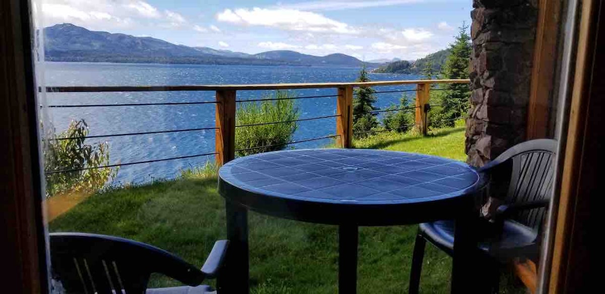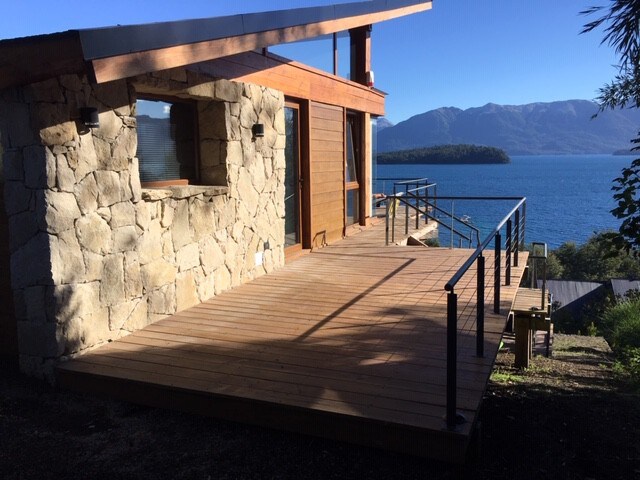 Con imponente vista sobre el lago y la Isla Victoria en la zona de Llao Llao. Una sola planta el living, cocina y comedor, dan a un balcón terraza en el jardín. Gran chimenea con asador. Sofá cama en el living. Dorm c/ cama King size, baño en suite Bajada propia a la costa de lago Servicios Wifi Balcón terraza con reposeras Ropa de cama y toallas se cambian c/ 5 días Secador de pelo Estacionamiento privado Exclusivo para parejas No hay desayuno No hay Televisión Se cobra limpieza final usd20