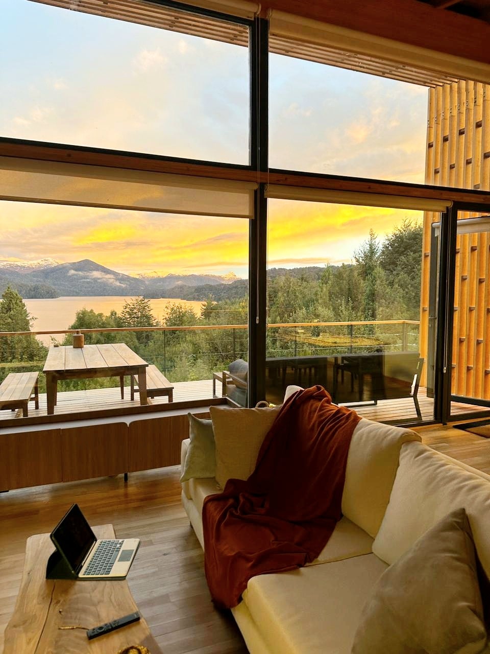 The charm of this house is immediately upon entering this modern space full of life, bathed in sun and light. The living room, dining room and fully equipped kitchen share a completely open space with stunning views of Lake Nahuel Huapi. The wooden deck is the perfect place to enjoy a magnificent patagonian sunset. THERE IS NO PROTECTION FOR BABIES/CHILDREN AT THE INTERIOR STAIRS AND BOTH EXTERIOR DECKS.