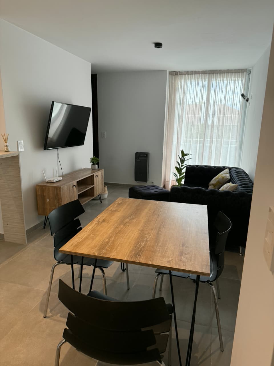 Departamento moderno y luminoso. Cuenta con un dormitorio con cama matrimonial, ropa de cama para un descanso reparador. El living-comedor es amplio y acogedor, con sillón, Smart TV, mesa con sillas y entrada de luz natural. La cocina integrada es funcional y práctica para estadías cortas o prolongadas. El edificio ofrece excelentes amenities, terraza con pileta, solárium con reposeras y asador con mesa, sillas y bacha, ideal para disfrutar del verano y compartir momentos al aire libre.