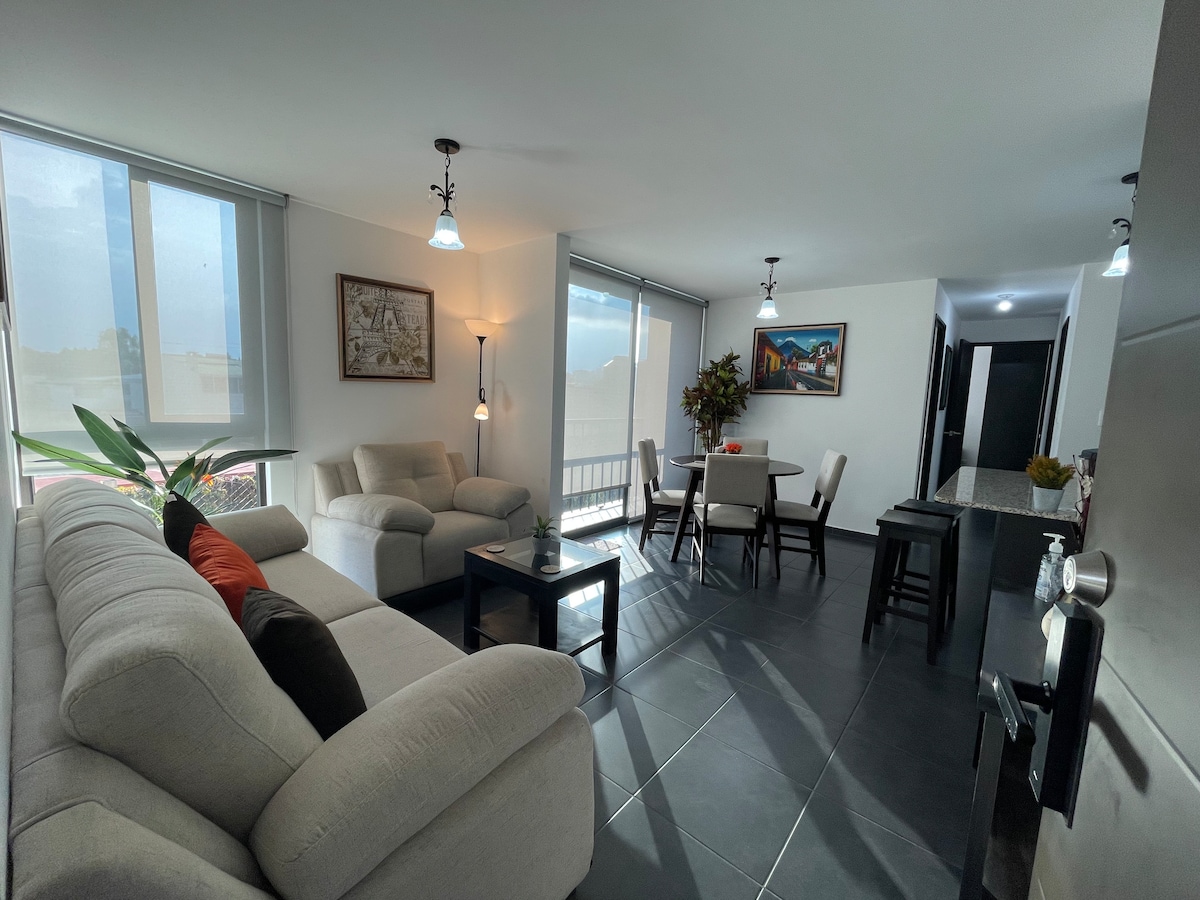 Spacious 2-bedroom apartment, located in a convenient, safe, up and coming neighborhood 15 min aways from the airport. Amenities include pool, gym, playground studio, social area, meeting room, game room, private parking, 24/7 security cameras and rooftop with electric heaters and a wonderful view of Guatemala city.