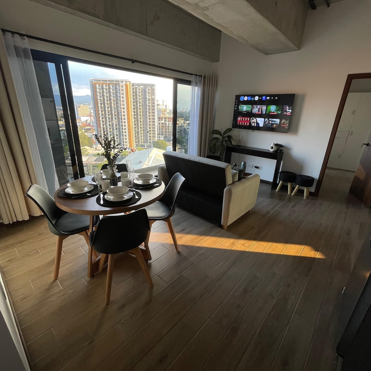 Imagine being surrounded by natural light in an elegant studio designed to reconnect with yourself. Located in the heart of Muxbal, this space offers seremity without disconnecting from the city. Perfect for travelers looking for more than just a place to sleep: here you'll find style, peace, and functionality. We feature panoramic walls with views of Guatemala City, the forests of Muxbal, and the iconic Agua, Fuego, Acatenango, and Pacaya volcanoes.