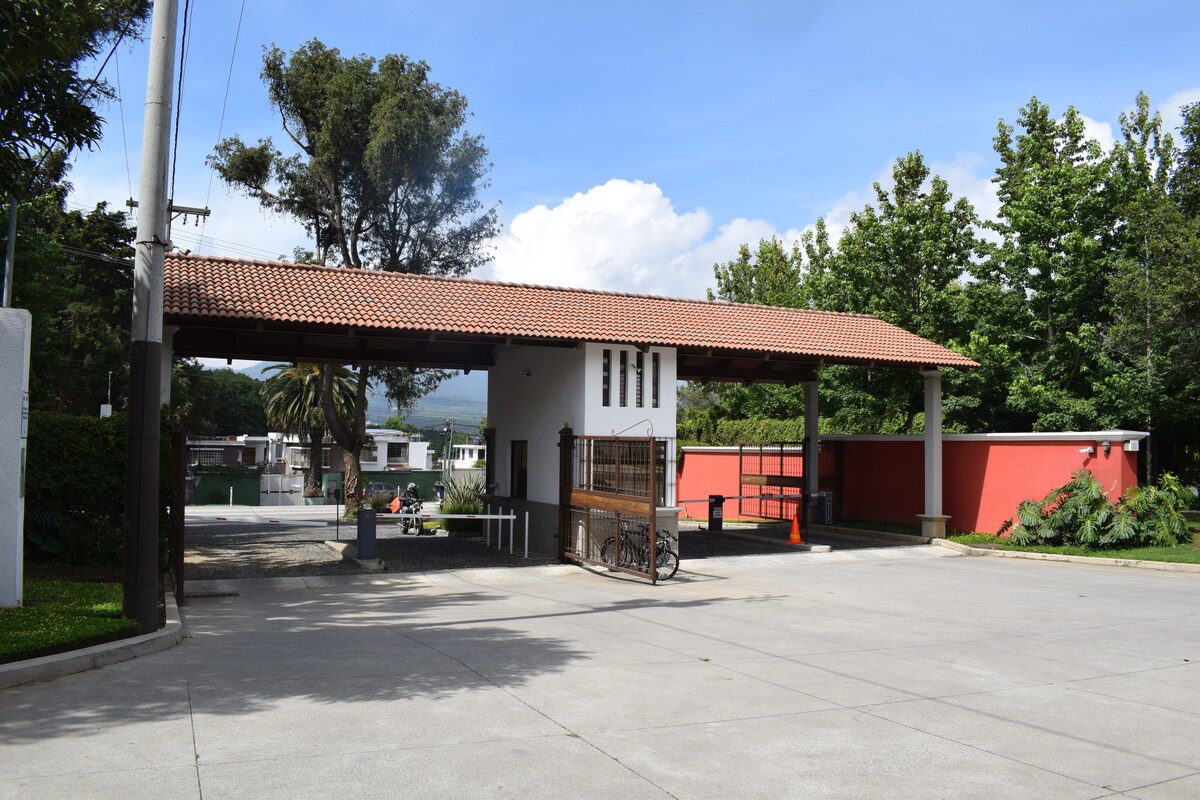 Escape to a peaceful apartment with stunning volcano views, just 15 minutes from Antigua Guatemala. Enjoy tranquility, nearby attractions like Hobbitenango, Altamira, and Earthlodge, scenic walking paths, and outdoor spots for coffee or sunset. Perfect for remote work with high-speed Starlink internet and a comfortable workspace. Guests also enjoy a fully equipped kitchen, BBQ, hammock, private outdoor areas, and parking for one car.