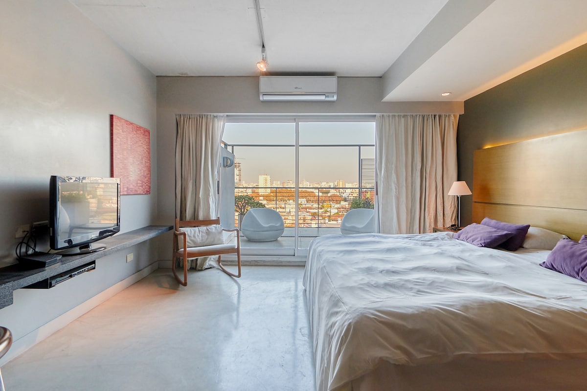 This unique one bedroom apartment is located in a luxury building in the best area of Palermo, close to the parks, the US Embassy and within 5 minutes walk to Palermo Soho and it's amazing restaurant, shopping and bar scene. Apartment includes an arcade game, Nespresso machine, 2 TVs with cable, high speed internet, in-unit washer-dryer and more! The building features 24 hours security, two pools, BBQ, gym, sauna, massage room, sky center, business center, media room, music room.