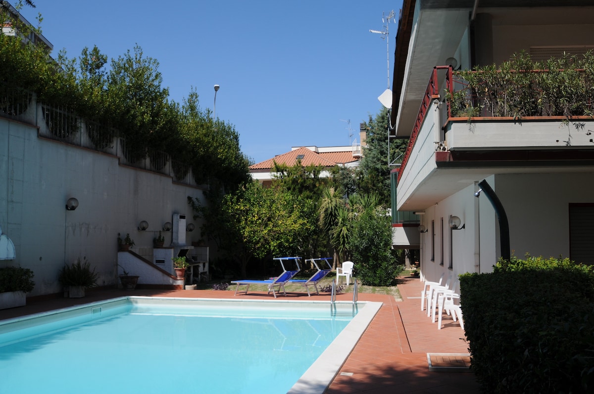 Situato al 1 piano e Ideale per 6/7 persone. Dotato di tutti i comfort per poter trascorrere una vacanza in tranquillità a contatto con la natura e con le bellezze del paesaggio tra borghi tipici,mare Adriatico e monti Sibillini.L'appartamento è dotato di 2 ampie camere con aria condizionata,1 bagno e 1 cucina con terrazzo dove poter mangiare. Il giardino e la piscina, condiviso con gli altri ospiti, godono di una posizione privilegiata da cui si gode di un bellissimo panorama.