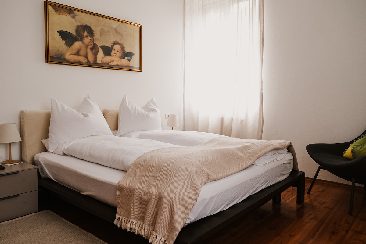 Entspann dich in dieser besonderen und ruhigen Unterkunft. Die Wohnung (50 m2) befindet sich im Obergeschoss eines Mehrfamilienhauses mit großer Terrasse und herrlicher Aussicht über die Stadt Bruneck. Sie verfügt über 1 Schlafzimmer mit rundem Bett (Durchmesser 220 cm), Wohnraum/Küche, Bad/WC. Die Lage des Apartments ist ideal um das Pustertal mit Seitentälern zu erkunden, ob es Skifahren/Mountainbiken am Hausberg Kronplatz ist, eine Wanderung in den Dolomiten oder eine Bergtour im Ahrntal.