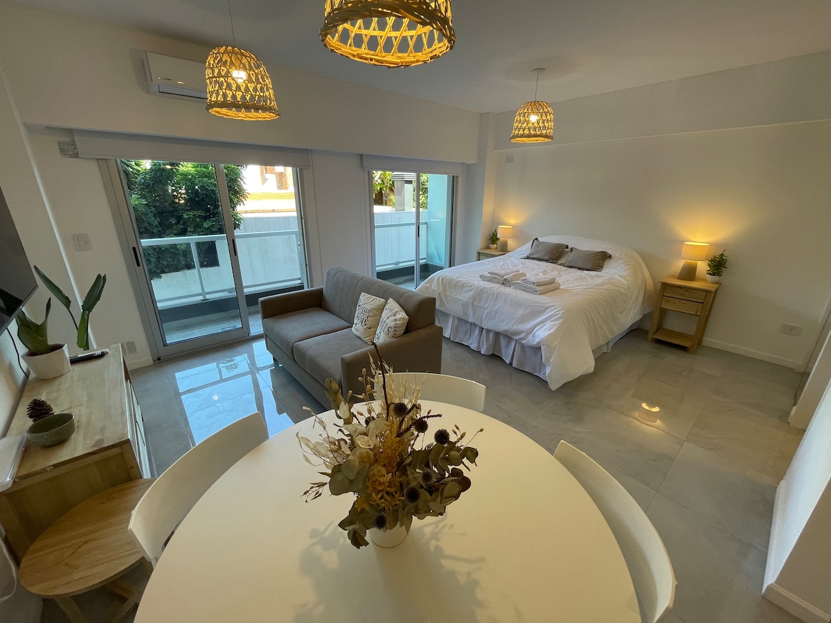 Luminoso monoambiente ubicado en DOHO, moderna zona residencial con variedad de bares, restaurantes y comercios, resulta ideal para estadías cortas. Cuenta con cocina eléctrica, microondas, heladera, cafetera, pava eléctrica, vajilla completa y balcón con vista a espacios verdes. Podrás disfrutar de la piscina y su parrilla, y salir a caminar por una de las zonas residenciales más bellas de Buenos Aires a solo 200 metros. Brinda un acceso cercano a subterráneo, tren y buses. ¡Te esperamos!