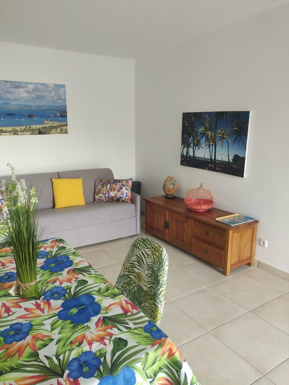 Bonjour Plézi location F2 c'est : - 1 chambre double. - Salle de bain accessible par la chambre ou le salon. - Une cuisine toute équipée. - Un salon avec télé, réseau câble et wifi - Canapé réversible pour 2 personnes - Une terrasse avec vue sur mer - Un espace en bord de mer privée de + de 100m2 avec barbecue, kayaks et hamacs à votre disposition - Parking privé - Transports à proximité (maritime, bus) - Golf à 2 minutes - Plages Anse-mitan et Anse à l'âne à 5 minutes