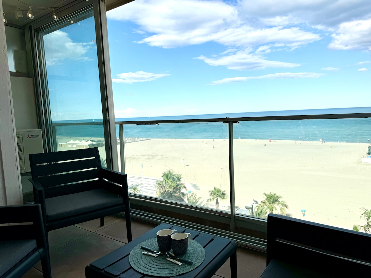 Détendez-vous dans ce logement calme et élégant. À louer un appartement pour trois personnes avec une vue exceptionnelle sur la mer avec une terrasse de 6 m² en première ligne, au premier étage d’une résidence avec ascenseur près du port de Barcarès. La plage se situe en bas de la résidence. Vous n’avez pas de route à traverser. Place de parking numérotée dans la résidence Équipement: machine à café Nespresso, micro-ondes, télévision, wi-fi gratuit ,ventilateurs et canapé convertible.