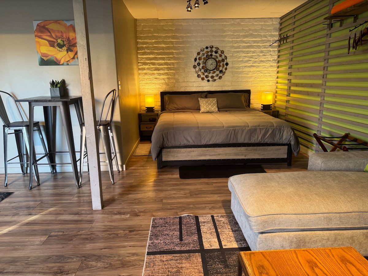 If you looking for a tranquil place in Sedona near downtown, then look no further. Close to restaurants, grocery stores, hiking, biking, shopping, parks and so much more. The neighborhood is very quiet and nice. Dogs and cats love the area as well! In the master bedroom you’ll see a king bed. The bathroom is just around the corner. There is a wonderful kitchen with everything you’ll need to cook a meal. The living room is amazing! The couch is so comfy especially next to the fireplace!