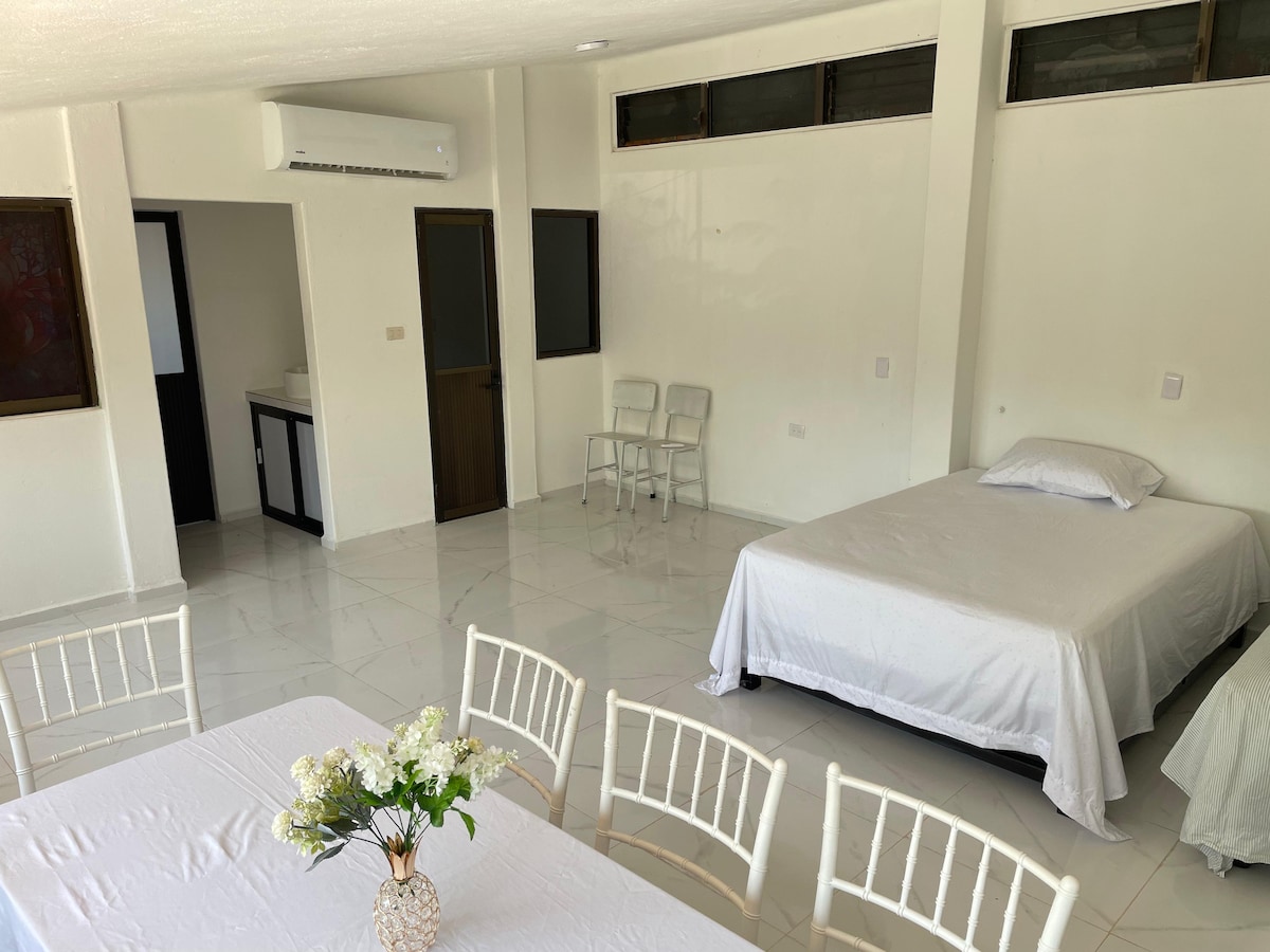 Disfruta de una experiencia de lujo en este céntrico alojamiento ubicado a una cuadra del Boulevard Bicentenario vía el Country y a 5 minutos del parque de Feria de Villahermosa. Consta de una habitación para 2 personas con todo incluido: cocina, refri, escritorio, TV, internet, wifi, clima, comedor, baño privado, plancha, secador de cabello etc. Es un sitio pensando para estar tranquilos y pasar un día inolvidable y una tranquila noche relajados. La zona es céntrica y segura.