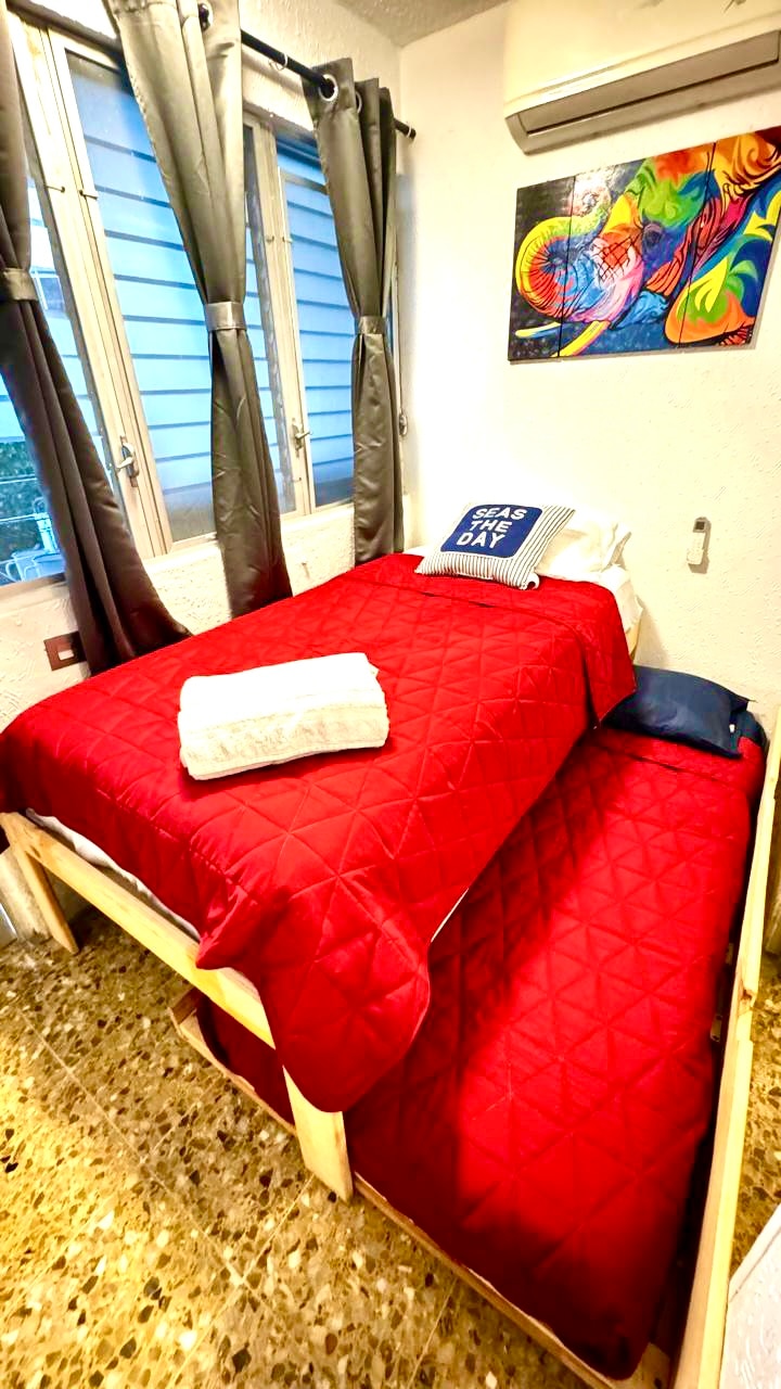 Pequeña habitación hasta para 2 personas se encuentra en un 3 nivel. Esta en un condominio de 3 departamentos con acceso limitado y seguro. La habitación cuenta cama matrimonial, Buro con lámpara, aire acondicionado, ventilador de techo, smart tv de 32”, barra / escritorio con frigobar, microondas, licuadora, parrilla eléctrica, vajilla, cubiertos y vasos para 2 personas, olla y sartén, baño con closet.