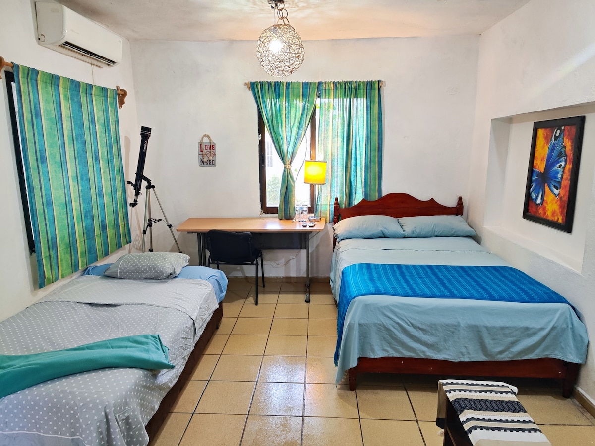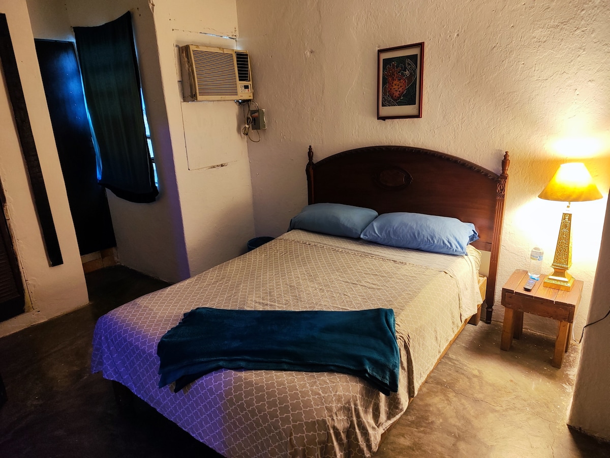 Pequeña habitación hasta para 2 personas se encuentra en un 3 nivel. Esta en un condominio de 3 departamentos con acceso limitado y seguro. La habitación cuenta cama matrimonial, Buro con lámpara, aire acondicionado, ventilador de techo, smart tv de 32”, barra / escritorio con frigobar, microondas, licuadora, parrilla eléctrica, vajilla, cubiertos y vasos para 2 personas, olla y sartén, baño con closet.