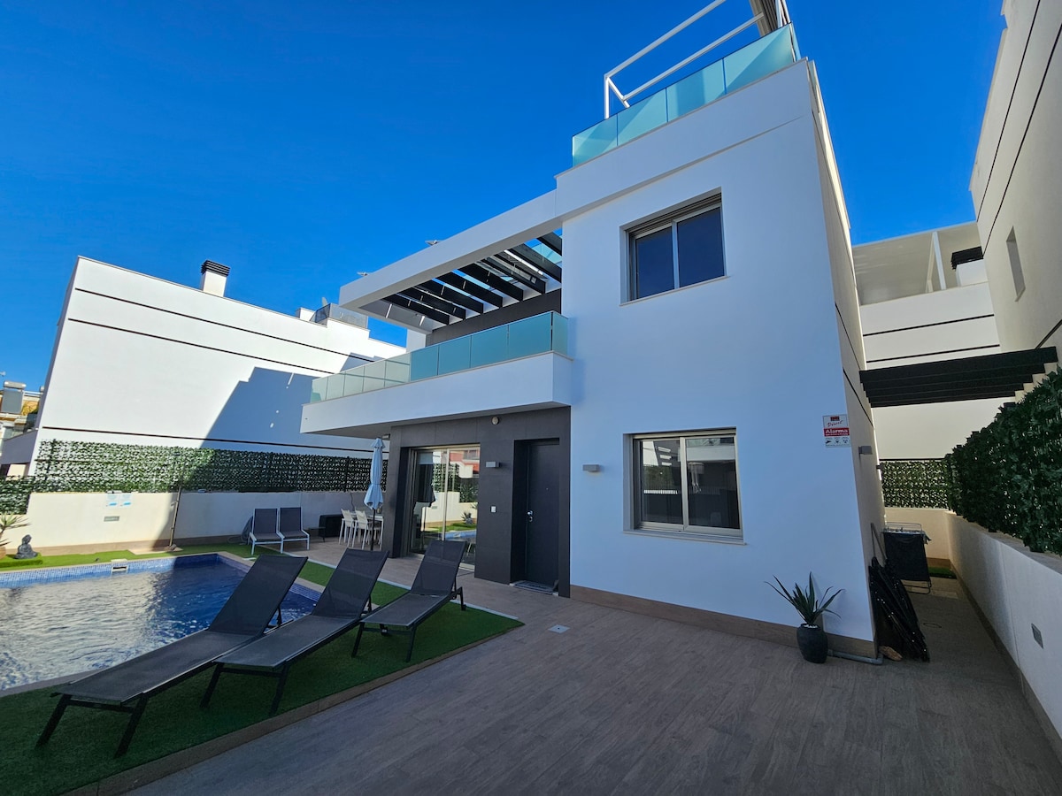 Nyere feriehus i moderne og koselig stil. Ett fullt møblert hjem med fokus på gode senger,dyner,uteområder,møbler og klimaanlegg på alle rom. Det er takparasoll på takterrassen samt parasoll utenfor stuen. Basseng ligger 10 meter fra vår eiendom Huset ligger i et stille og avskjermet boligområde som er barnevennlig. Det er kun eiere av boligene som kommer seg inn med bilen i området. Det er en port på utsiden. Barnevennlig. Kort vei til badestrender, matbutikker, restauranter, golfbaner, etc.