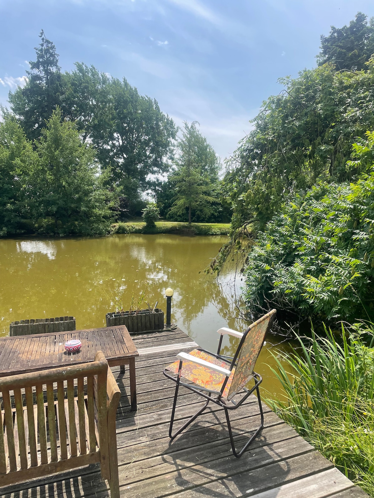 On the banks of its 2-hectare pond, l'Angélus is simply an unusual, timeless place dedicated to lovers... An atypical haven of peace nestled in the woods, an island with a fully-equipped beach for dining in the sun until very late on summer evenings, a cosy house with a large fireplace and 139cm Smart TV. Box 4G, DVD, ultra-fast web, full air conditioning, terrace in front of the pond with large table, BBQ, large pontoon and rowing boat. Impressive silence, nature, wildlife and eternity bath.