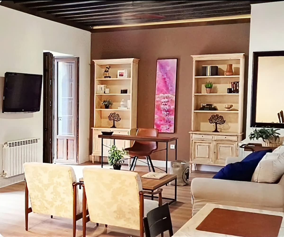 Casa Lesquinas. Apartamento histórico de uso turistico recién reformado en Ávila, ciudad patrimonio de la humanidad. Combina tradición y modernidad en un espacio acogedor y con caracter: techos altos con artesonados. Obras de arte de la exposición La Mirada Inquieta 2 habitaciones (principal en suite) 2 baños, salón con TV, aire acondicionado, calefacción, cocina con isla, comedor, despacho, Wifi y parking cercano. Ideal para conocer Ávila a pié, los pueblos con encanto y las ciudades cercanas