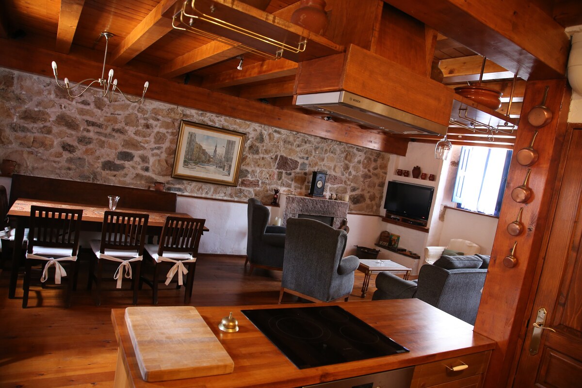 Our MOUNTAIN LOFT is specially designed for couples or couples with children. It stands out for its spacious and comfortable rooms, all with fantastic mountain views. - Living room with fireplace and panoramic views. - Fully equipped kitchen. - Fold-down double bed and sofa bed. - Full bathroom in natural stone. - Heated panoramic porch. - Summer kitchen with barbecue and wood-fired oven. - Natural stone swimming pool with a sunbathing area. - Fountains, gardens, and spacious terraces.