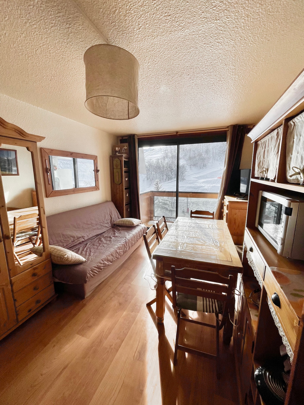 Domaine des Sybelles, au cœur de la grande station familiale du Corbier : studio 4 personnes en étage élevé avec balcon panoramique sur toute la vallée. Pour le jour : salon et coin repas, TV. Pour la nuit : 2 banquettes-lit pouvant former un grand lit double, et 2 lits superposés. Tous les commerces, restaurants, animations et les télécabines sont aux pieds de l’immeuble. Station entièrement piétonne. Accès à tarif réduit à la grande piscine chauffée, au hammam sauna et jacuzzi de la station.