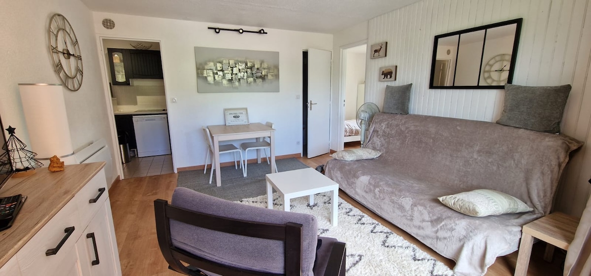 Studio plein sud au pied des pistes r idéal pour 4 personnes + bébé. Situé au 13ème, il offre une vue panoramique sur les montagnes et un ensoleillement maximal. L’appartement dispose de lits superposés repliables, d’un canapé-lit confortable et d’une cuisine entièrement équipée ( dont lave-vaisselle, expresso). La Résidence Soyouz offre un accès direct aux pistes et services à proximité : garderie, supérette, restaurants, piscine, cinéma. Domaine des Sybelles, 310 km de pistes