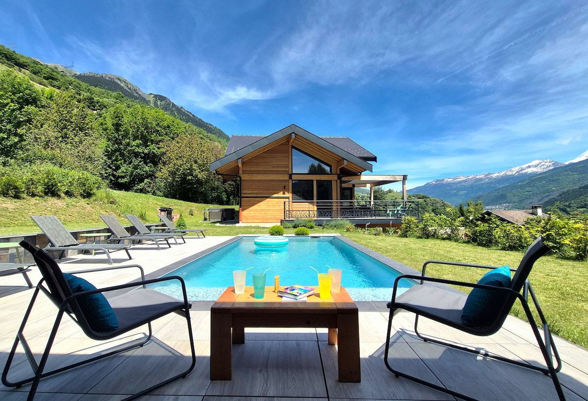 Grand chalet contemporain 185m2 (2023). En lisière d'une zone naturelle préservée, entouré de montagnes. SPA Jacuzzi 4 saisons (38°C ajustable). Mai-sept: piscine privée chauffée à 27-28°C et sécurisée, pool house avec salon de détente et sanitaires. Plancha. Pétanque. Netflix. Garage. Idéalement situé dans la Vallée de la Haute Tarentaise. Nombreuses activités été/hiver à proximité: rafting et voie verte à 4km, randonnée, La Plagne Paradiski à 15-20min/13km, bobsleigh.. Tous commmerces à 3km.