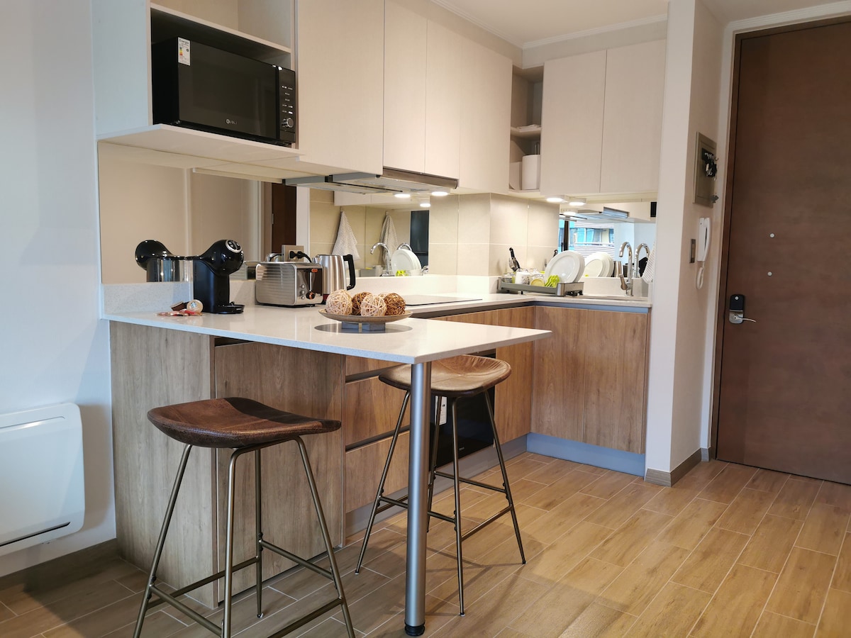 Nuevo y acogedor estudio en la mejor ubicación de Pucón, a pasos de playa grande, centro, y aislado del ruido de la calle principal. Cuenta con cama de 2 plazas, un futón de 2 plazas, cocina full equipada, baño completo, WiFi, TV 49" con Netflix, Disney+ y más, terraza, calefacción, parrilla, cafeteras, 2 bicicletas de uso ilimitado, entre otros. Estacionamiento público frente al acceso al edificio disponible. Incluye ropa de cama, toallas, e insumos básicos de baño y cocina para cada estadía.
