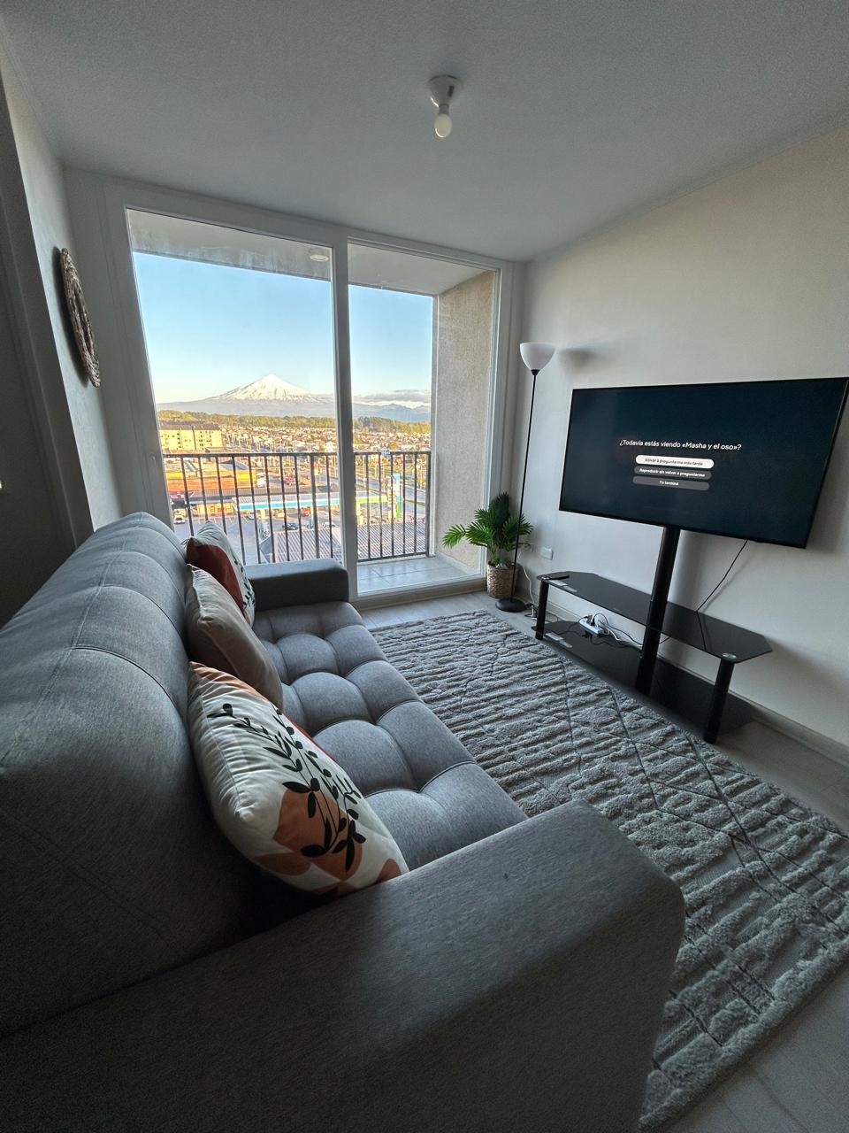 Departamento estudio cercano al centro. Completamente amoblado, con ventanas de termopanel y vista al volcán. El dpto incluye: Cama matrimonial Cocina americana equipada Amplia terraza equipada Parrilla eléctrica Calefactor eléctrico Estacionamiento privado *Se desinfecta con Amonio Cuaternario. Otros servicios: Piscina exterior, gimnasio, sauna, sala de juegos, quincho y lavandería.
