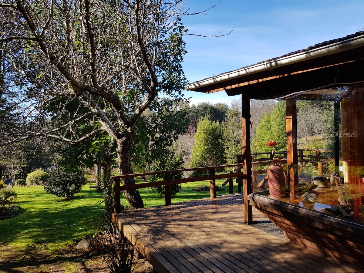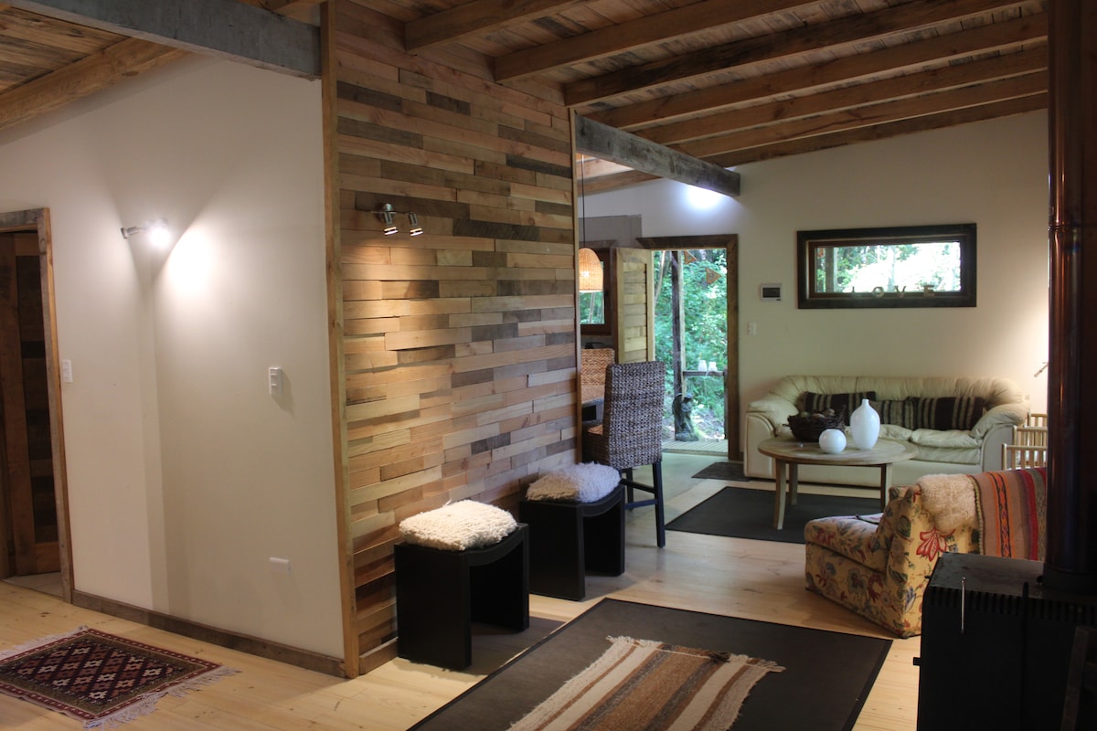 The cabin has a natural feel and rustic touch within amazing surroundings of the native forest and trees all around you. The cabin has been built with native and sustainable wood. it is well equipped. Is very cute and cozy space with a large veranda with an outdoor seating. There is a nice river with access within the property with a picnic table next to it to enjoy listening the river. Big sunny green garden, picnic table to enjoy the view of the mountains, a fire-pit and couple of hammocks.